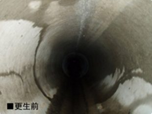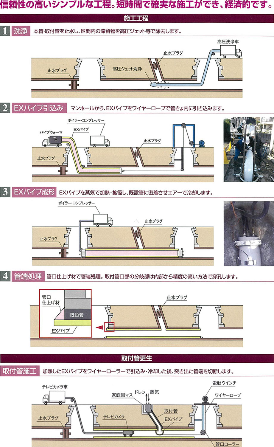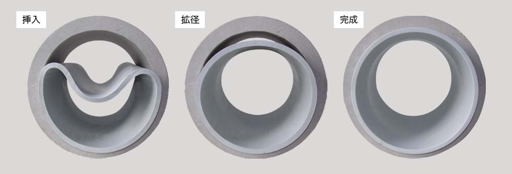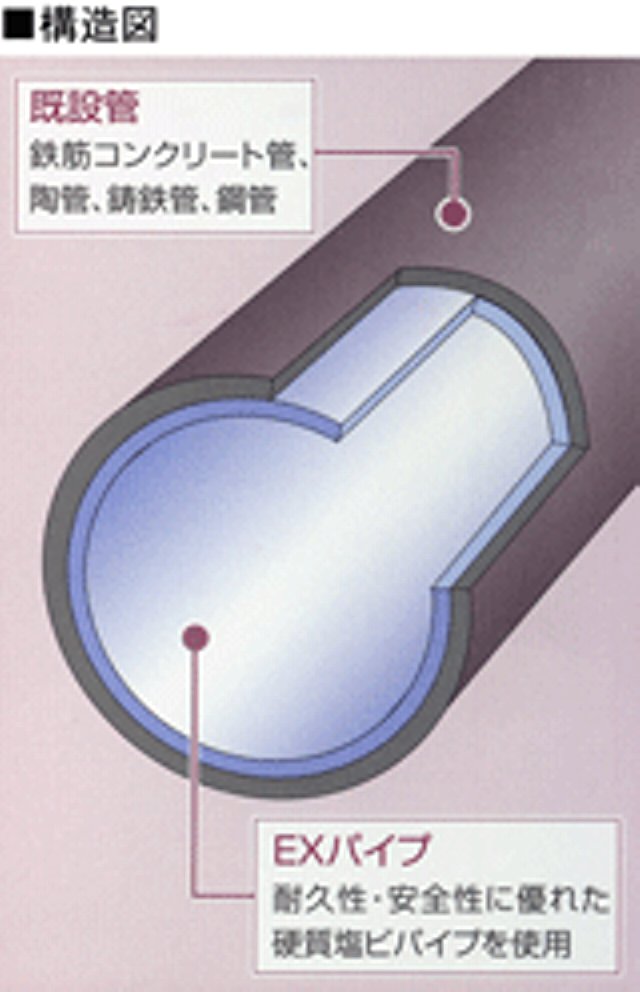 EX工法は、世界で初めて単 一材料の硬質塩ビパイプの軟化特性を利用し実用化した工法で、耐久性・安全性・耐薬品性等に優れた硬質塩化ビニル樹脂をベースとするEXパイプを、既設管内に挿入し蒸気により加熱・加圧することで円形に拡径・復元し、既設管路内面に密着したパイプを形成する更生工法です。