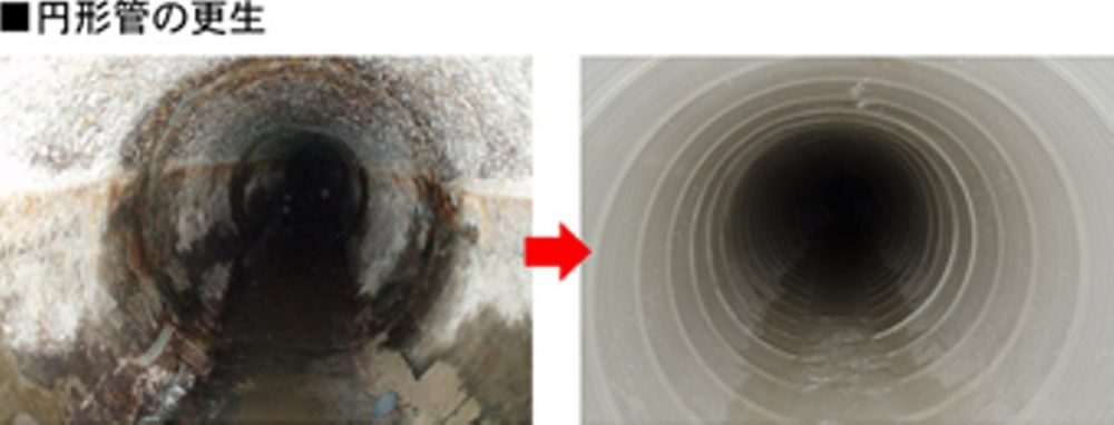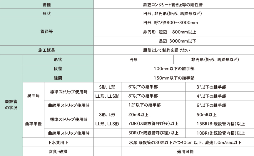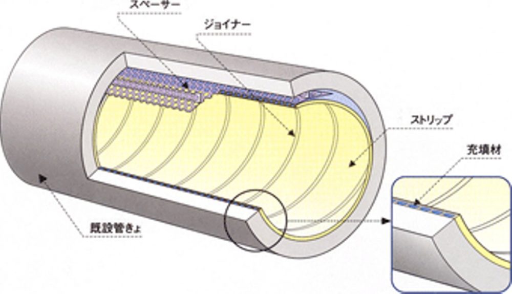 ダンビー工法は、硬質塩化ビニル製の強靭な帯板(ストリップ)を既設管内面にスパイラル状に巻立て、かん合用部材(SFジョイナー)を使い製管します。既設管との空隙に充てん材を注入することで既設管と更生部材が一体化し、スピーディーに大口径管きょを蘇らせる工法です。
