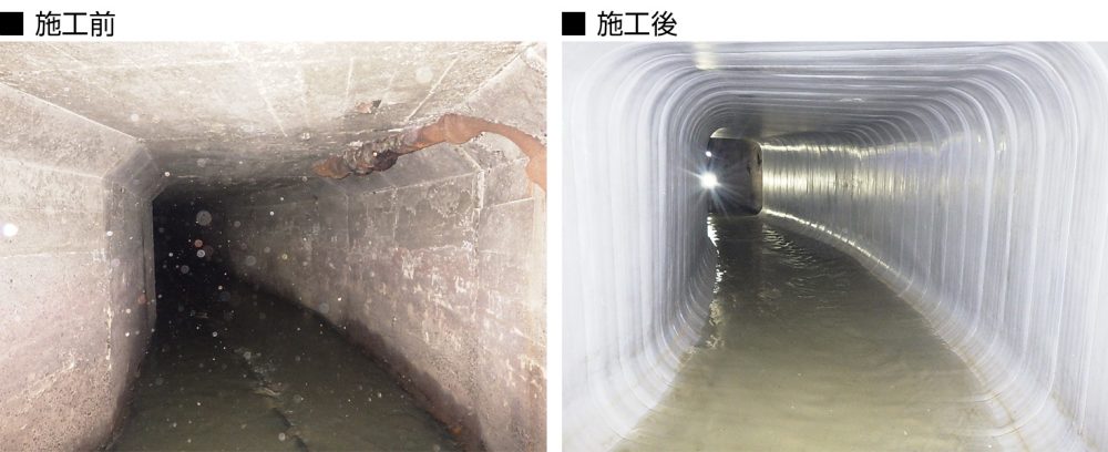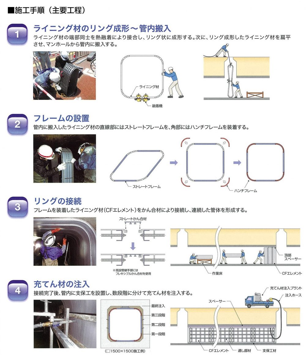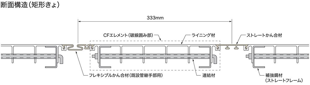 クリアフロー工法は、管きょの更生工法で、高密度ポリエチレン製ライニング材の背面の直線部とハンチ部に補強鋼材を連結材により一体化したCFエレメントを用いて、複合管を築造する管きょ更生工法です。