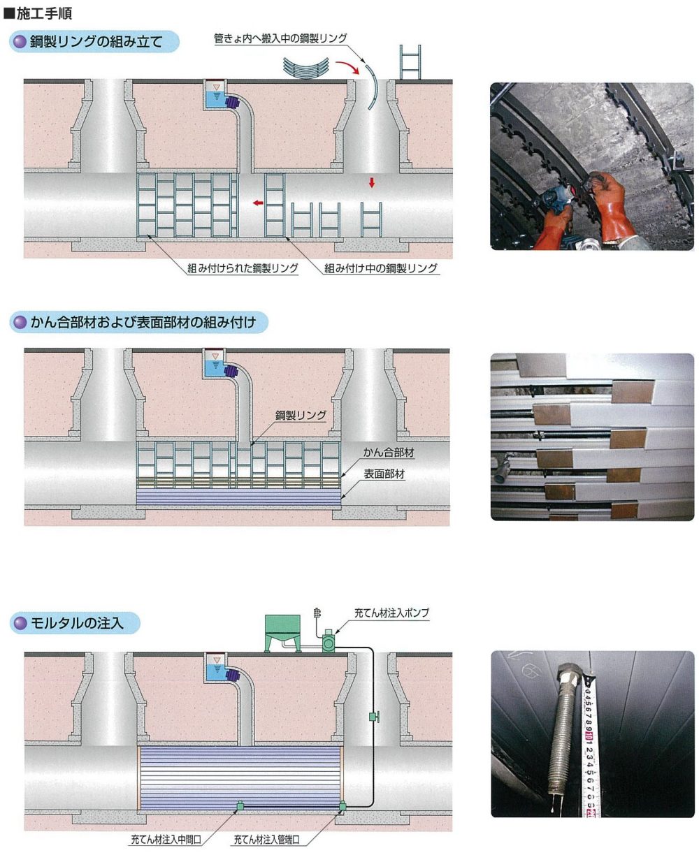 パルテム ・ フロ ーリング工法は、既設管きょ内で組み立てた鋼製リングに高密度ポリエチレン製のかん合部材と表面部材を組み付けて更生管を構築し、更生管と既設管との間に充てん材を注入し既設管きょを複合管として更生する工法です。