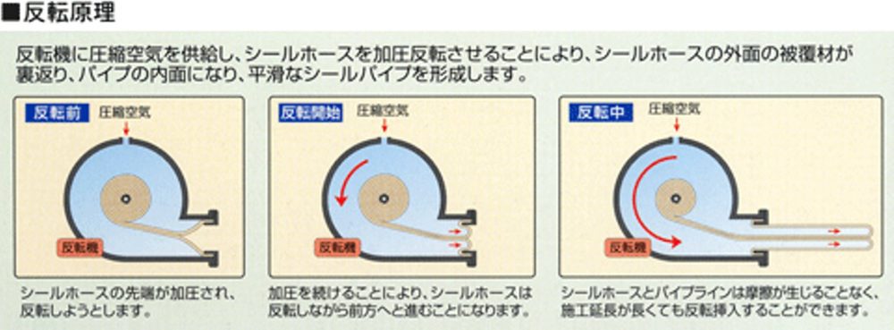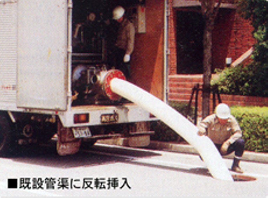 ホースライニング工法は、熱硬化性樹脂を含浸させた強靱なシールホースを、既設マンホールから既設管内に反転加圧挿入し、管きょ内で加熱硬化させることで、管の内面に密着させ新しいパイプを形成する工法です。