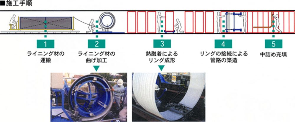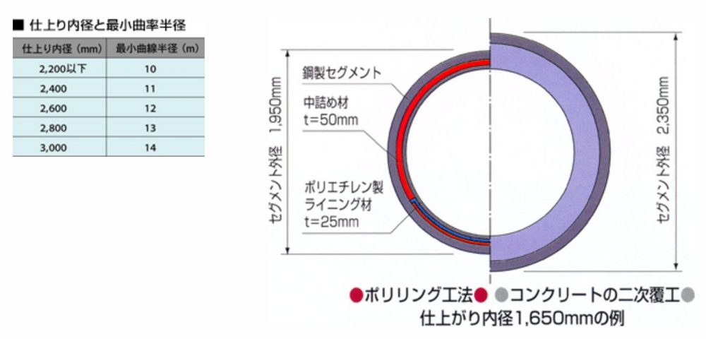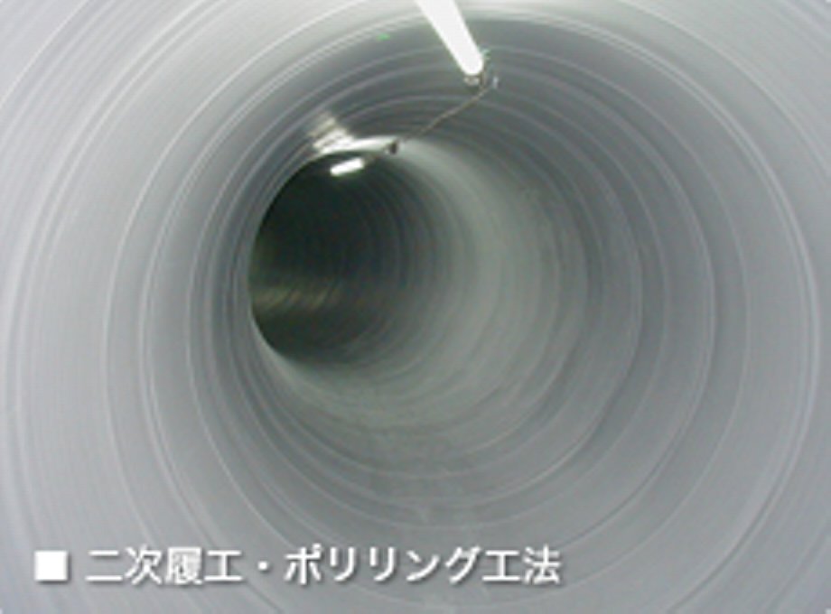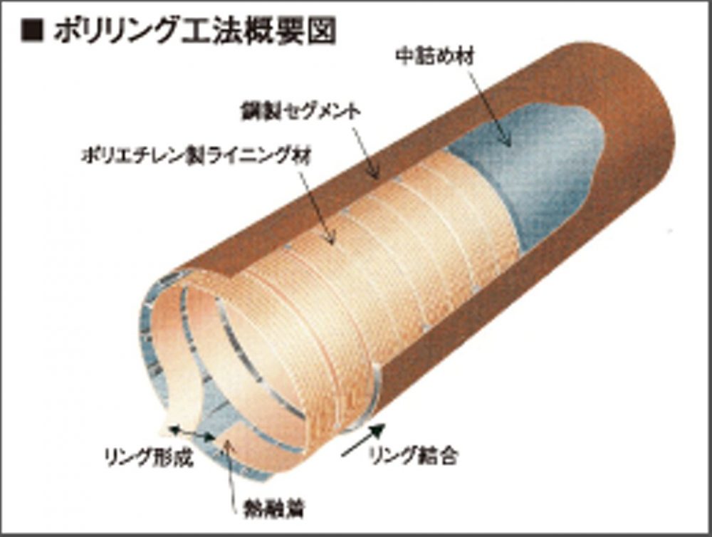 ポリリング工法は、耐久性・耐薬品性に優れた高密度ポリエチレン製の帯状ライニング材を、シールドトンネル内でリング状に成形・連結し、鋼製セグメントの二次覆工材として用いる薄肉二次覆工工法です。