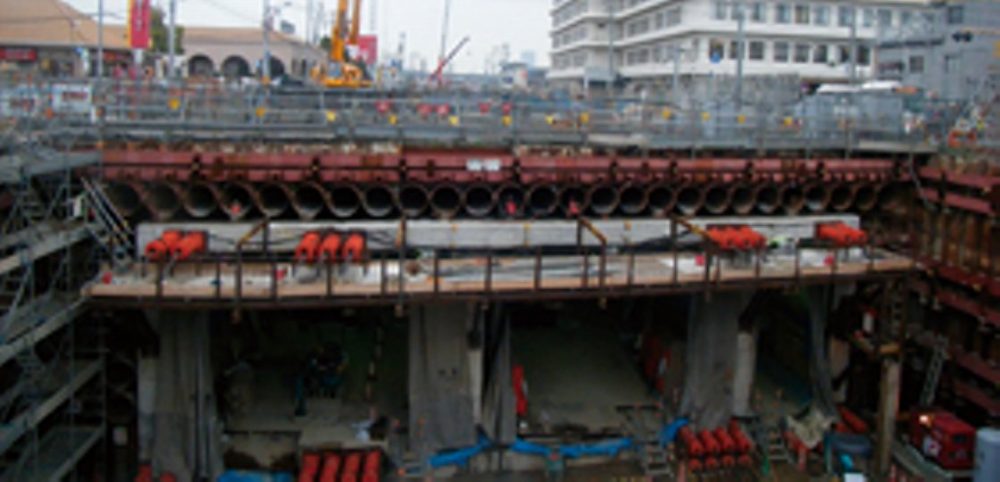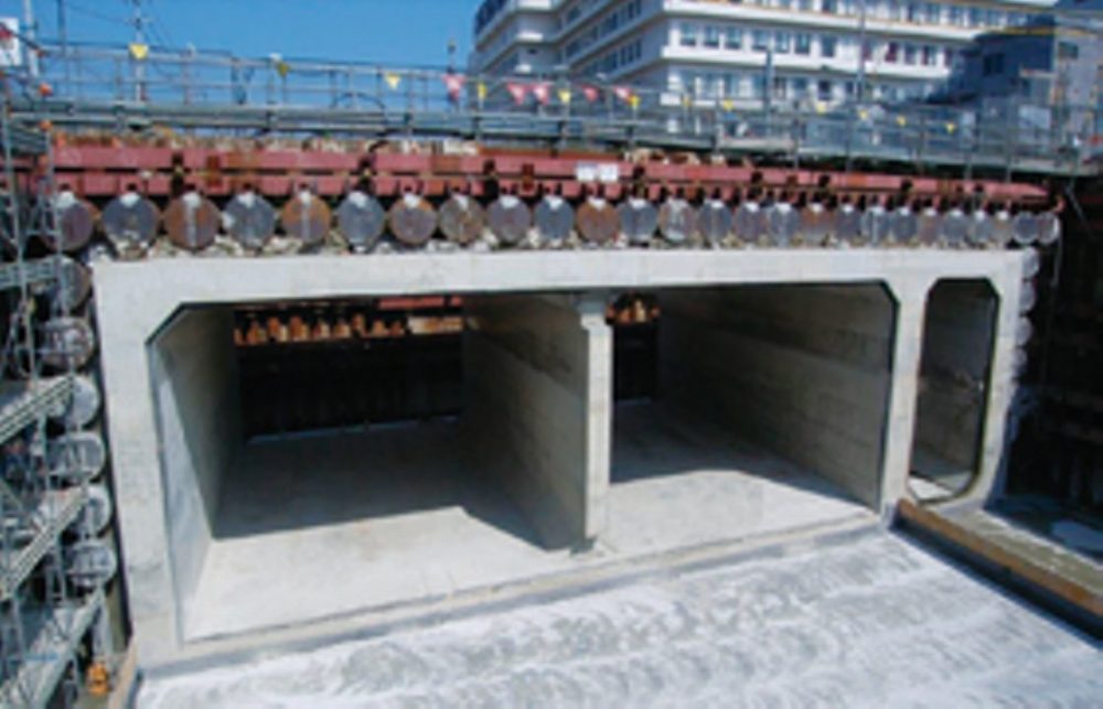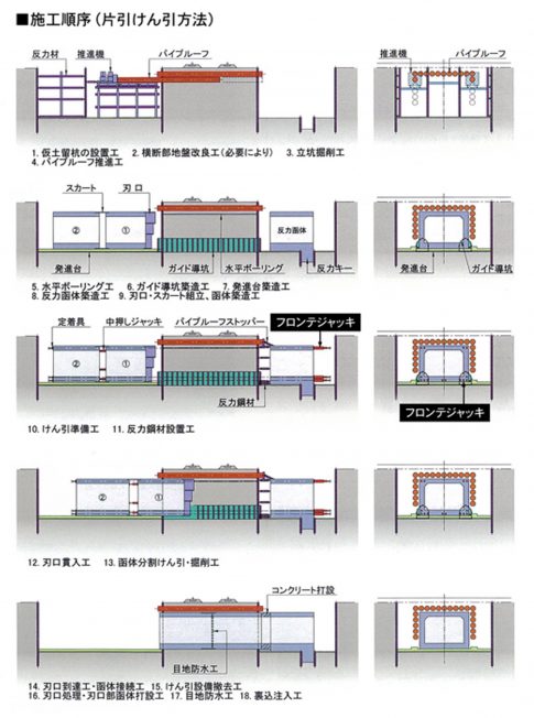 フロンテジャッキング工法は、鉄道及び道路下に非開削で地下構造物を作る(函体を埋設する)施工方法で、到達側の反力体と発進側の函体をPC鋼線で連結し、専用のジャッキ(フロンテジャッキ)を使用して函体を所定位置までけん引(掘進)する工法です。