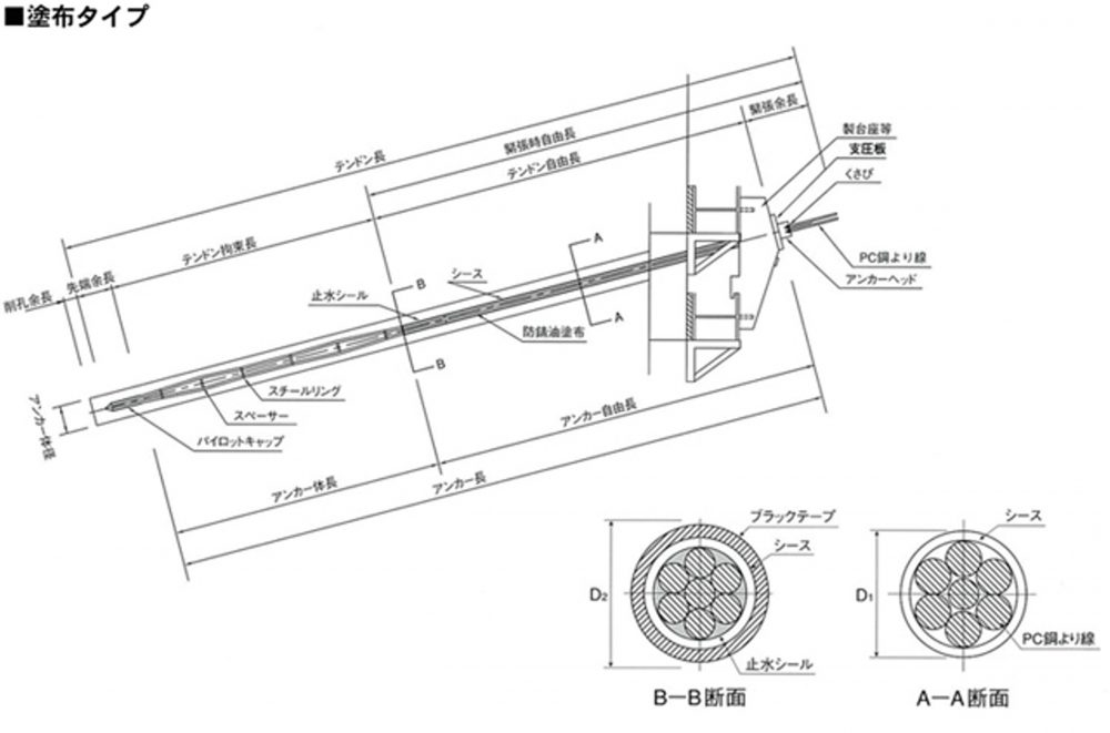 自由長部のPC鋼より線を一括して防錆油とシースで被膜する「塗布タイプ」と、一本ずつ防錆油とアンボンドチューブで被膜する「アンボンド」タイプがあります。