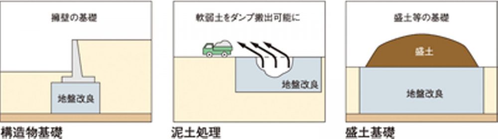 撹拌効率がよく、ばらつきの少ない改良強度が得られ、土質の性状と必要強度や改良目的によって、低コストで高品質な改良がえられます。