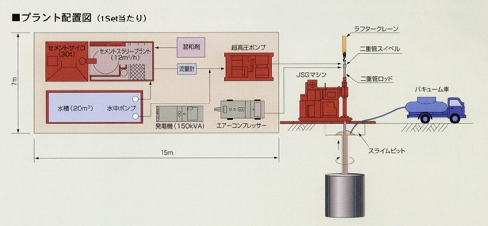 JSG工法は、圧縮空気を伴った超高圧硬化剤を、回転させながら地中に噴射し地盤を切削すると同時に、地盤に直径1m~2mの円柱状の固結体を造成する工法です。