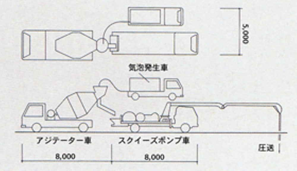 エアーモルタル工法は、セメント、骨材、水で練られたモルタルと、空気(気泡)をミキシングしたもので、軽量で流動性に優れており空洞充填に適した充填材です。