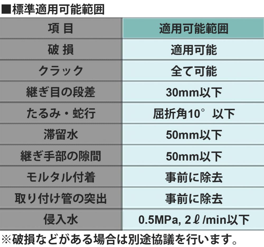 継手段差部、折れ角度、隙間、侵入水等のある現場にも適用可能です。