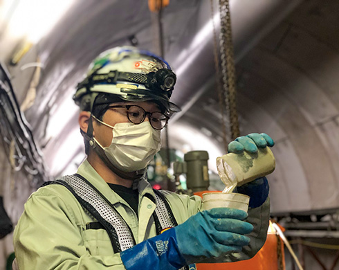 私は地盤工事部に所属しており、主に薬液注入工法や高圧噴射撹拌工法といった地盤改良工事の施工管理を担当しています。仕事内容としましては、現場が始まる前には打ち合わせを行い、作業員や材料・機械の手配を行います。現場では工事写真の撮影、安全・品質・工程の管理や確認・調整作業が主になります。