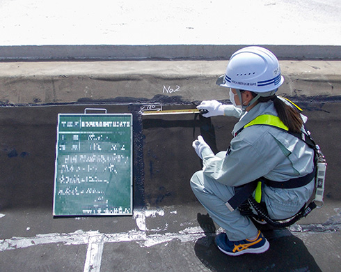 朝礼時にKY(危険予知)活動で作業の危険なポイントとその対策を確認し、その日の一日の流れを元請や協力業者と打ち合わせを行ってから作業に取り掛かります。日中は安全面では安全帯使用状況の確認・指導、安全設備の設置、立ち入り禁止措置等を行い、協力業者や他の業者が安全に作業できるようにします。品質面では材料の使用量や出来形などをチェックして品質の確認を行ったり、施工状況の写真撮影をしています。現場が動いていない日は会社や現場事務所で書類の作成や打ち合わせ・現場の下見に行ったりしています。