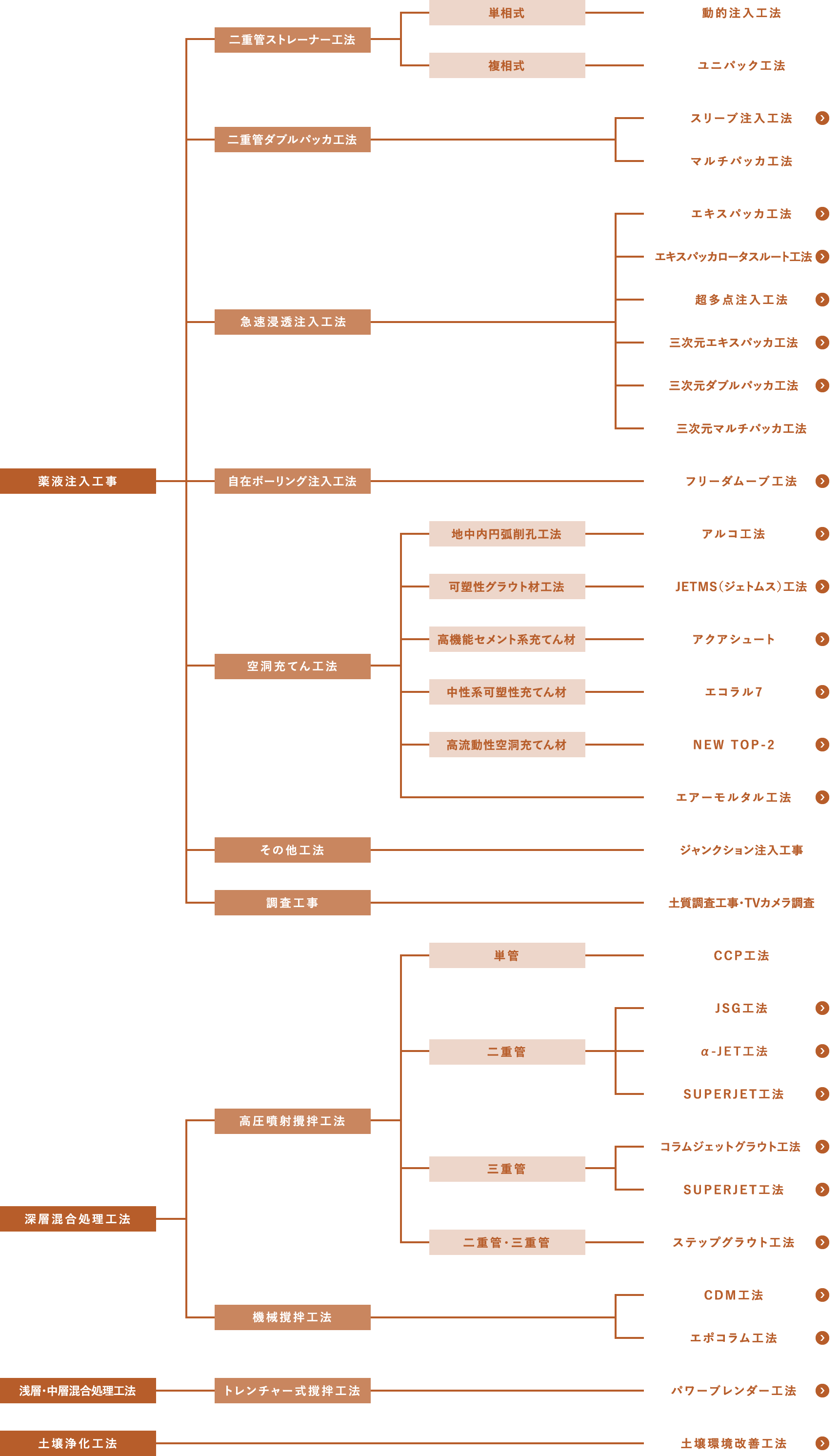 地盤の条件や構造物の種類、施工環境に応じ、各種薬液注入工法や高圧噴射・機械撹拌工法など、 多様な工法の中から最適な工法をご提案いたします。 さらに、土壌改善に向けたご提案まで、地盤改良に高度な技術と幅広い視点で対応します。